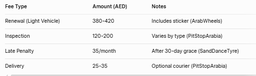 The renewal fee will start at AED 380-420 for light vehicles, with inspection fees ranging from 120-200 (if the inspection is required) and 25-35 delivery fees. The penalties for delayed renewals will be 35 monthly penalties, while driving with expired fees will cost 500+ in fines.